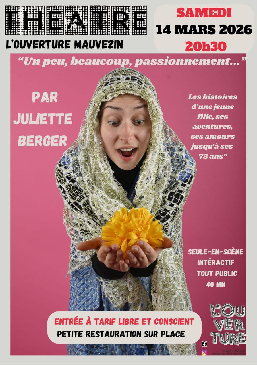 Samedi 14 mars à partir de 20h30 : « Un peu, beaucoup, passionnément » est un seule-en-scène écrit, mis en scène et joué par Juliette Berger.