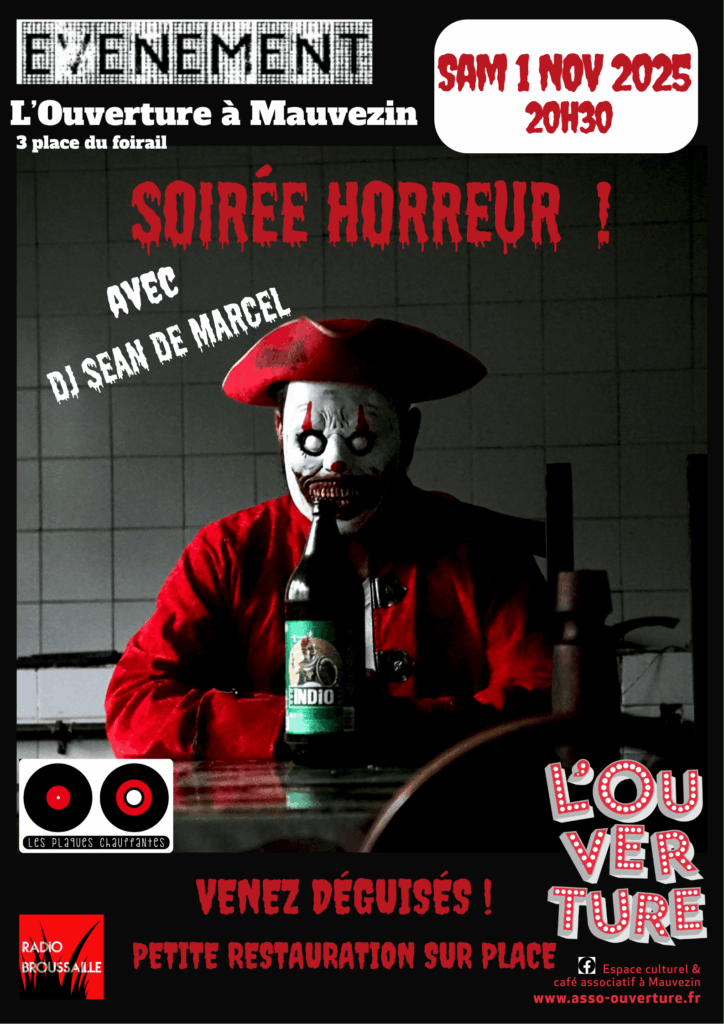 Samedi 1er novembre mettez votre déguisement le plus terrifiant et venez danser et boire 1 verre avec nous sur la sélection horrifiante de Sean de M.A.R.C.E.L ![]()